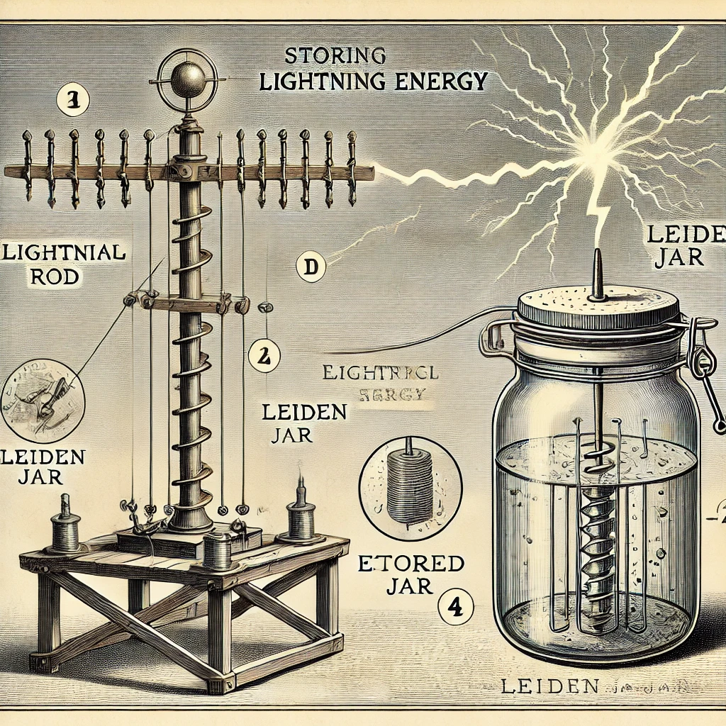하지만, 번개의 전기를 직접적으로 저장하려는 연구는 라이덴 병의 발명으로 이어졌습니다. 라이덴 병은 1745년 이그나지오 폰 쉴링과 피터 반 뮐레멘에 의해 발명된 장치로, 고전압의 전기를 저장할 수 있는 능력을 가지고 있었습니다. 이 장치는 번개처럼 강력한 전류를 저장할 수 있었으며, 번개 전기를 저장하기 위한 실험에 사용되었습니다.